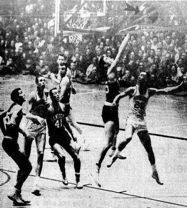 Kentucky's Ed Beck (#35) taps in a shot over teammate John Crigler (#31) and Vern Hatton (#53)