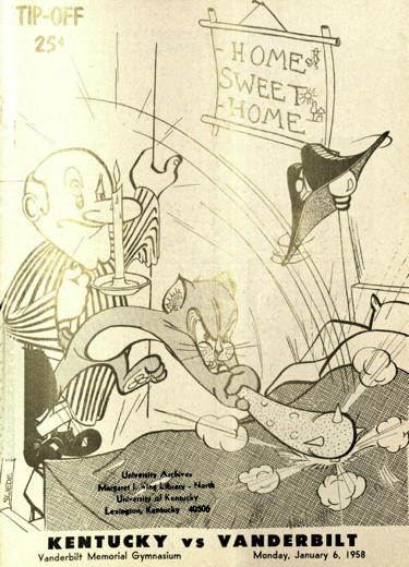 Ed Beck blocks a shot by Vanderbilt's Jim Henry while Johnny Cox (#25) looks on and Earl Adkins (#41) blocks out Vandy's Martin Holland