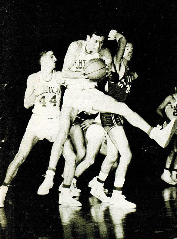 Sid Cohen grabs the ball in front of a St. Louis player while Bill Lickert (#44) looks on