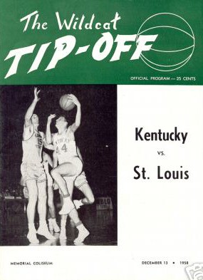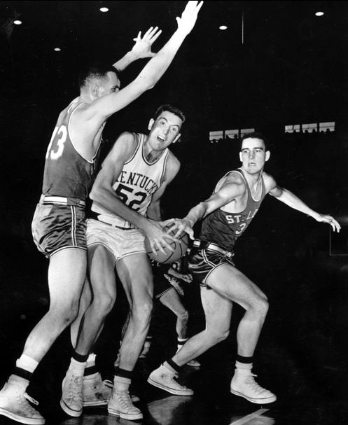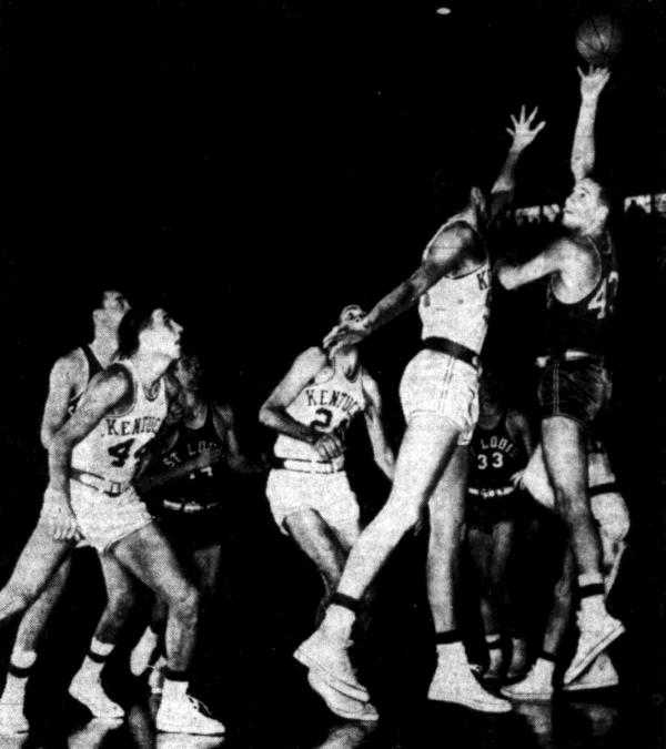 St. Louis center Bob Ferry shoots a hook shot as Don Mills stretches to defend while Billy Lickert (#44) and Johnny Cox (@34) look on.