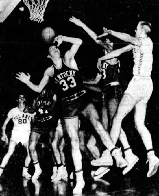 Bobby Slusher (#33) loses sight of the rebound as Tulane's Vic Klinker and Bill Lickert reach for the ball.