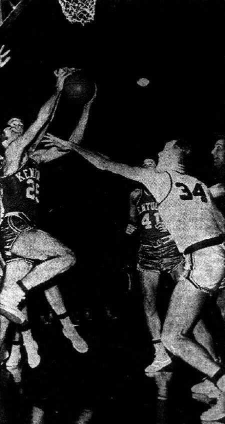 Bill Lickert (#41) drives between Ole Miss defenders Ivan Richmann (#22) and Louis Griffin (#34)