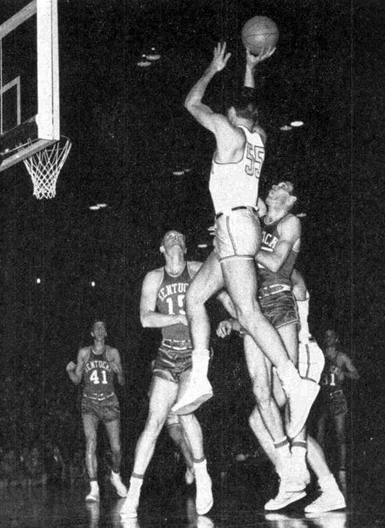 Marquette's Joel Plinska (#55) goes high for a shot over Kentucky's Johnny Cox (#25) and Phil Johnson (#15)