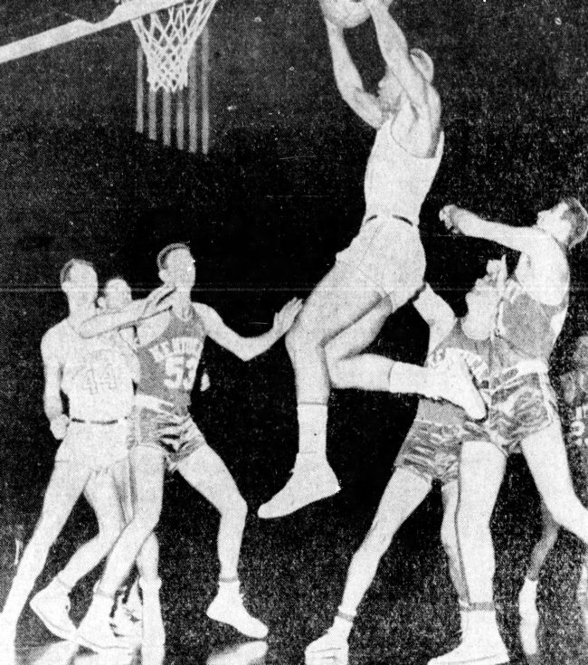 Marquette's Walt Mangham grabs a rebound while Don Mills (#53), Bill Lickert (#41) and Marquette's Don Kojis (#44) look on