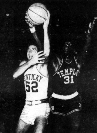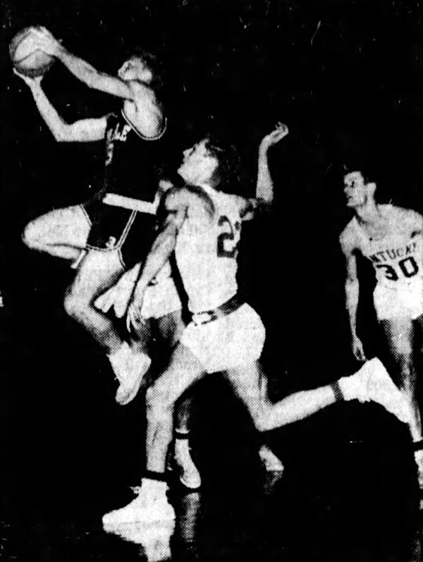 Kennedy drives for a layup in front of Sid Cohen (#22) while Bennie Coffman (#30) looks on