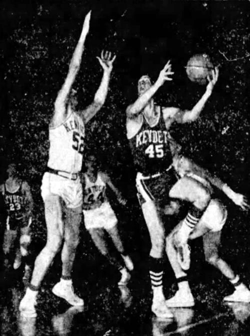 VMI's Dick Fravel (#45) shoots a hook shot against Kentucky's Vincent Del Negro (#52)
