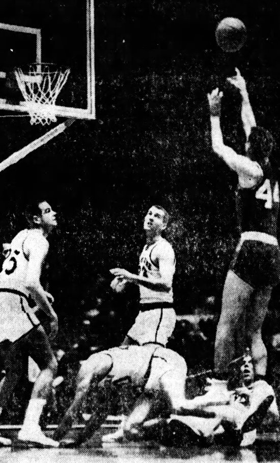Carroll Burchett (#40) shoots while watched by teammate Roger Newman along with Notre Dame's Bill Crosby (#12), Karl Roselser (#14) and Eddie Schnurr (#4)