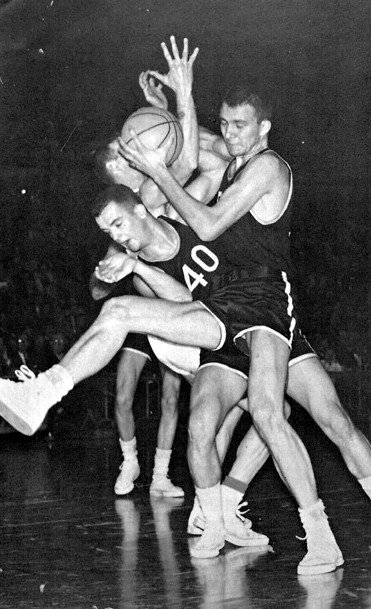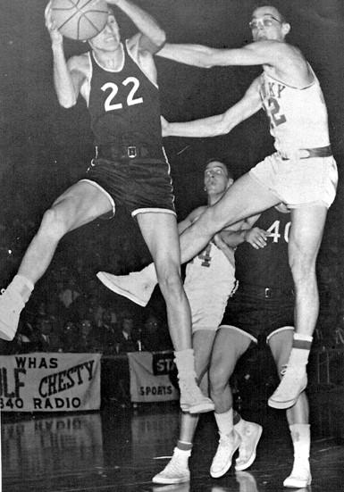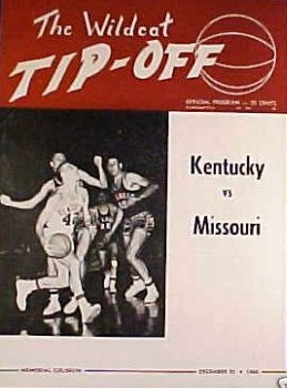 Missouri's Joe Scott (#22) grabs a rebound in front of UK's Roger Newman. In the background are MU's Ron Cox (#40) and Bill Lickert