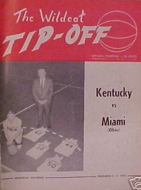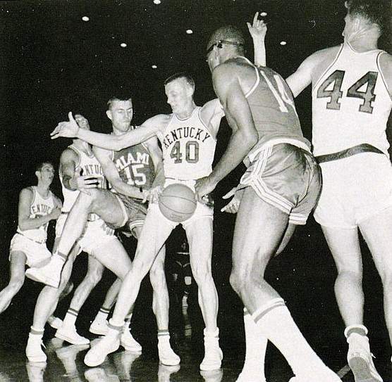 Cotton Nash jumps against Miami's Ralph Wright to open the 1961-62 season. Also in the photo are Kentucky's Scotty Baesler (#14) and Larry Pursiful (#24) along with Miami's LeVern Benson (#4) and Gerald Saunders (#3)