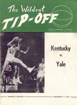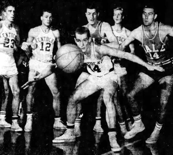 Scotty Baesler (#14) watches the ball go out of bounds while preventing two Yale players Rick Kaminsky and Richard Derby (#14) from retrieving the ball. Also shown are UK's Roy Roberts (#23), Allen Feldhaus (#12) and Cotton Nash.