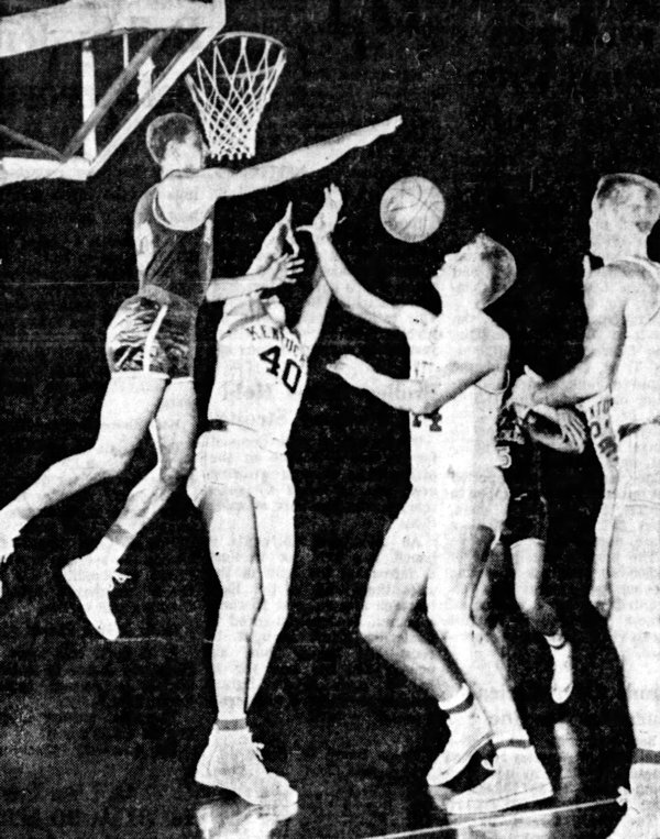 Virginia's Anthony Laquintanto hits the ball toward a teammate while UK's Carroll Burchett (#40), Cotton Nash and Roy Roberts try to intercept