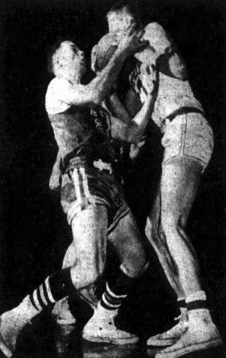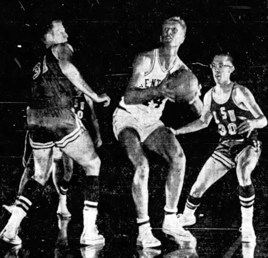 Cotton Nash looks to score while defended by LSU's Maury Drummond (#36) and George Nattin (#30)