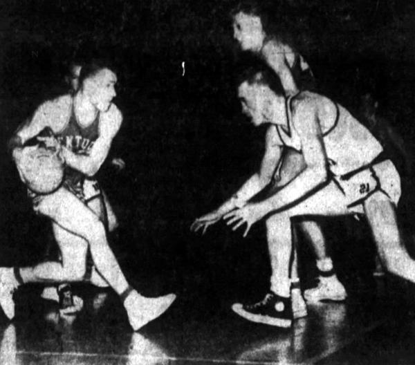 Kentucky's Allen Feldhaus is guarded by Georgia's Harold Morris (#21) while Cotton Nash is in background