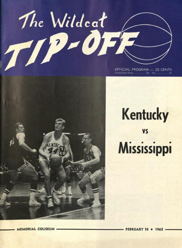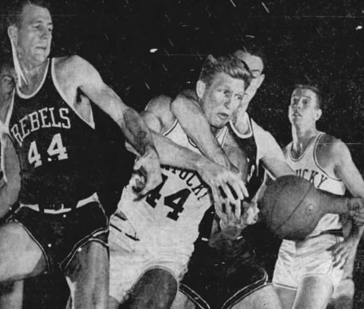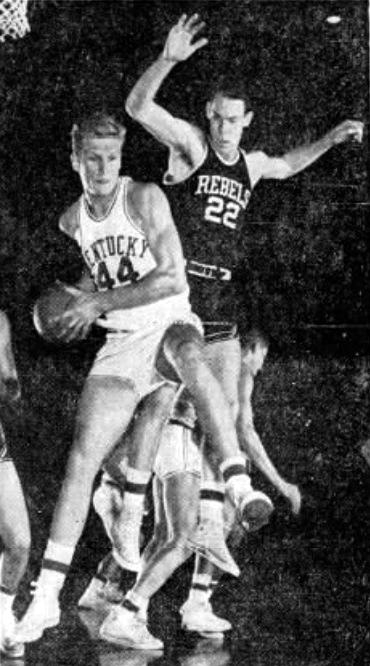 Cotton Nash is wrapped around the neck by Ole Miss forward Bill Bolton as Ole Miss' Bill White (#44) and Larry Pursiful look on
