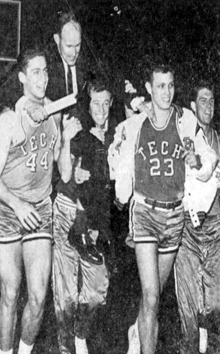 Tech player Ron Scharf (#44) and an unidentified player carry Tech coach Whack Hyder on a victory ride ahead of Bill Eidson (#23) and R.D. Craddock
