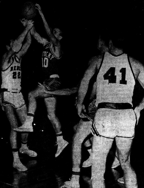 Randy Embry (#10) is met by Ole Miss defender Bill Bolton (#22) while El Edmonds (#41) looks on