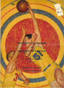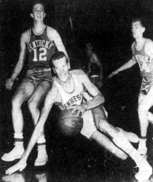 Tennessee's A.W. Davis (#20) works between Wildcats Ted Deeken (#12) and Roy Roberts (#23). In the background is Vol captain Jerry Parker (#42)