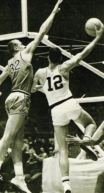 Cotton Nash (#44) and Larry Conley (#40) fight off Notre Dame players for a rebound