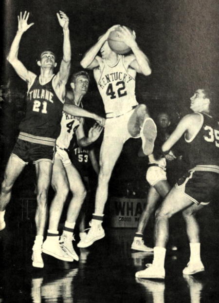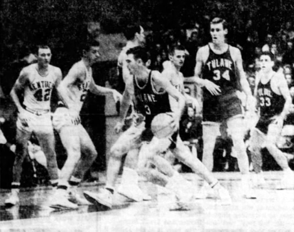 Tulane's Denny Shoup (#3) probes the Kentucky defense. Shown is Kentucky's Randy Embry, Mickey Gibson (#42) and Charles Ishmael (#22) along with Tulane's George Fisher (#34) and O.J. LaCour (#33)