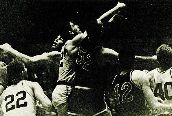 Louie Dampier (#10) and John Adams (#45) secure a rebound in front of Notre Dame's Larry Sheffield (#35) while Notre Dame's Ron Reed (#44) and Pat Riley (#42) look on
