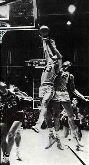 Vanderbilt's Clyde Lee (#43) fights teammate Bob Grace (#42) for a rebound while Mobley (#25) and Louie Dampier look on