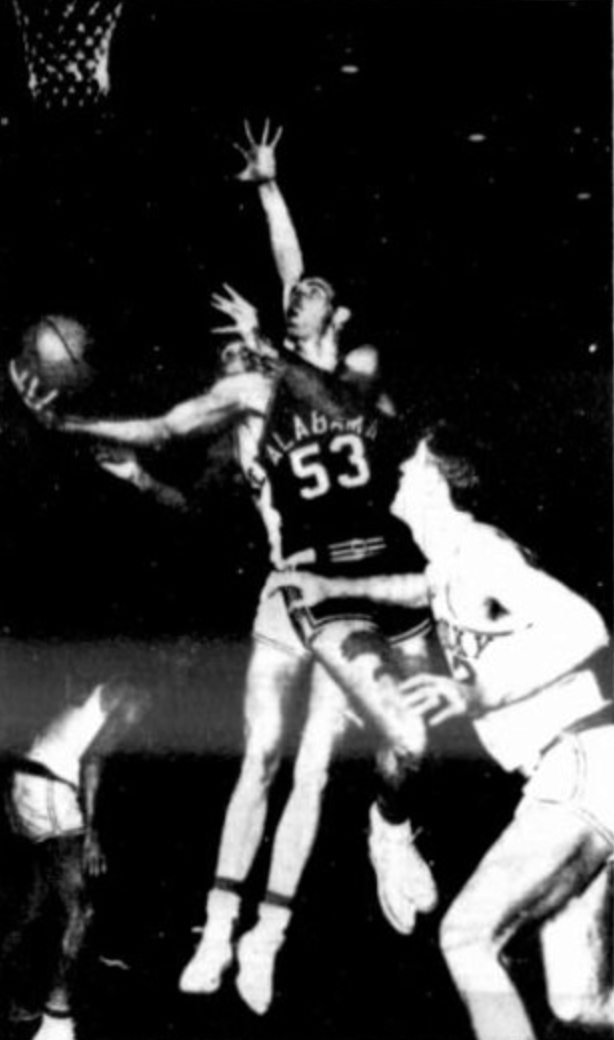 Alabama's Bob Andrews (#53) slides in between UK's Larry Conley and Pat Riley for a layup