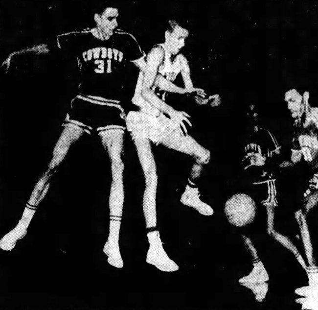 Hardin-Simmons' Dick Nagy (#31) gets tangled with Larry Conley while fighting for the ball