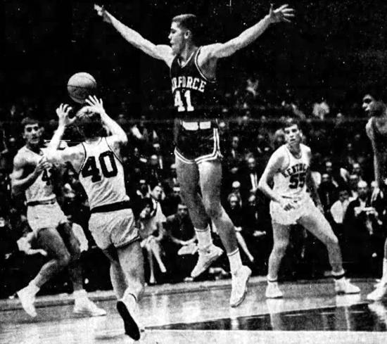 Larry Conley (#40) passes to Pat Riley (#42) while defended by Air Force center Ed Sullivan (#41). Shown on wing is UK's Thad Jaracz (#55)