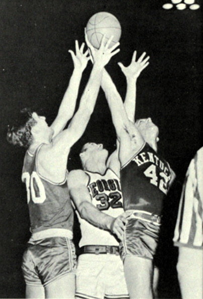 Tommy Kron (#30) and Pat Riley (#42) fight Georgia's Ray Jeffords (#32) for a rebound
