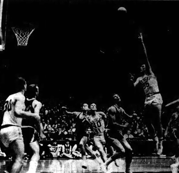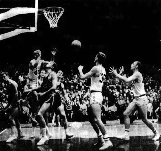 Thad Jaracz (#55) shoots a hook shot over Clyde Lee (#43)while Larry Conley (#40) and Bo Wyenandt (#41) fight for position and Tommy Kron (#30) and Jerry Southwood under the basket