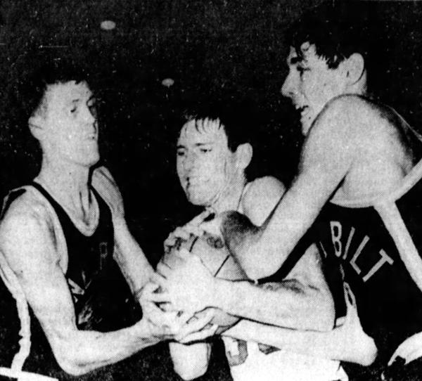 Tommy Kron fights Clyde Lee (left) and Ron Green (right) for the ball