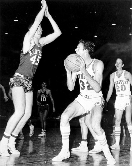 Tennessee's Austin 'Red' Robbins (#32) looks to score vs. Kentucky's Cliff Berger (#45) while Louie Dampier (#10) and UT's Tom Hendrix (#20) look on