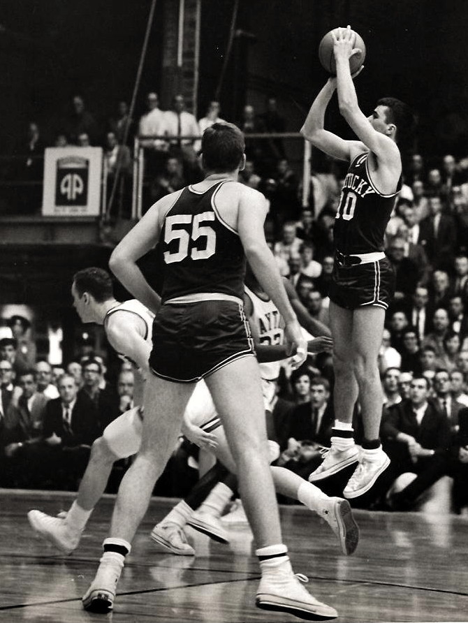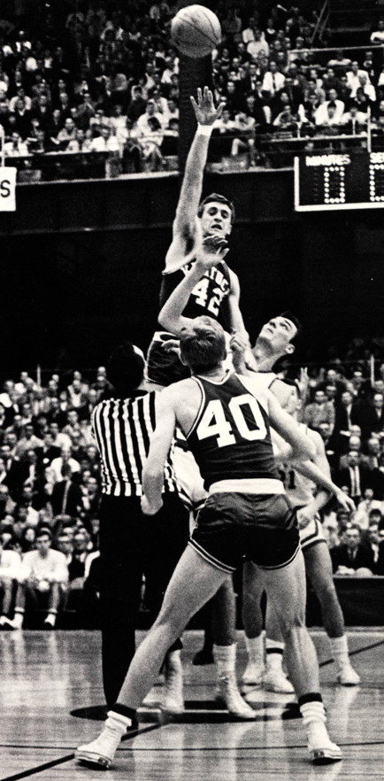 Pat Riley (#42) jumps center over 7-footer Henry Finkle to tip the ball to Larry Conley (#40)
