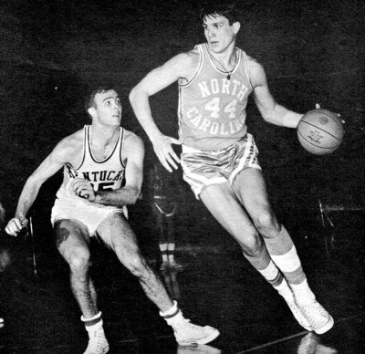 Pat Riley (#42) defends against UNC's Larry Miller (#44) as Bob Lewis (#22) looks on