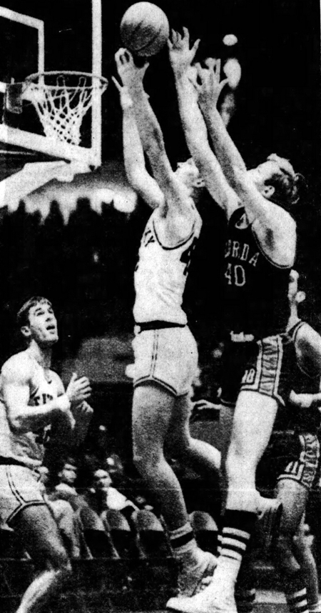 Cliff Berger fights off Florida's Jeff Ramsey (#40) for a rebound while Pat Riley watches