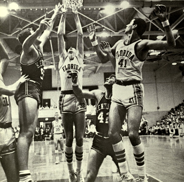 Florida's David Miller reaches for the ball alongside Kentucky's Thad Jaracz and Pat Riley (#42) and Florida's Neal Walk (#41)