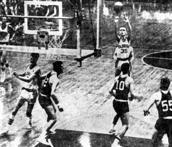 Florida's Skip Higley (#35) shoots over the UK defense. Shown are Pat Riley (#42), Louie Dampier (#10) and Thad Jaracz (#55)