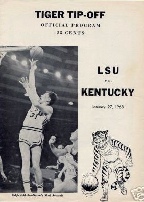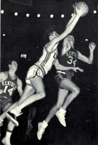 LSU's Pete Maravich stretches for a shot in front of UK's Mike Casey (#34) while (#14) Bill Busey (?) looks on