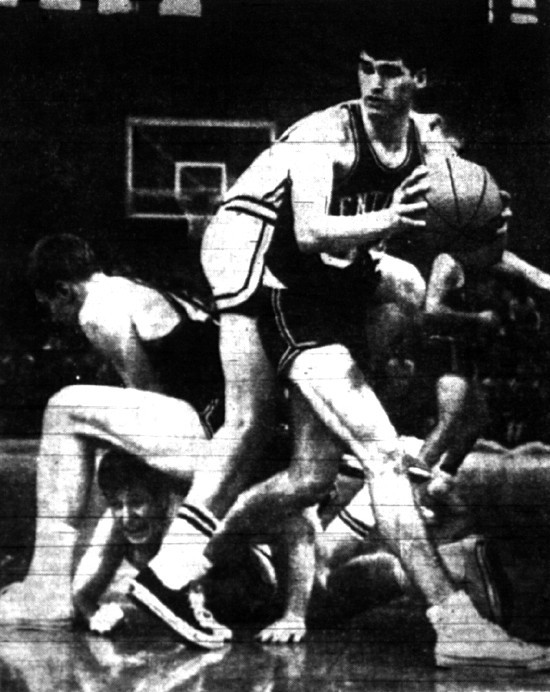 Mike Pratt (#22) and what appears to be Dan Issel (#44) fight LSU's Ralph Jukkola (#31) for a rebound
