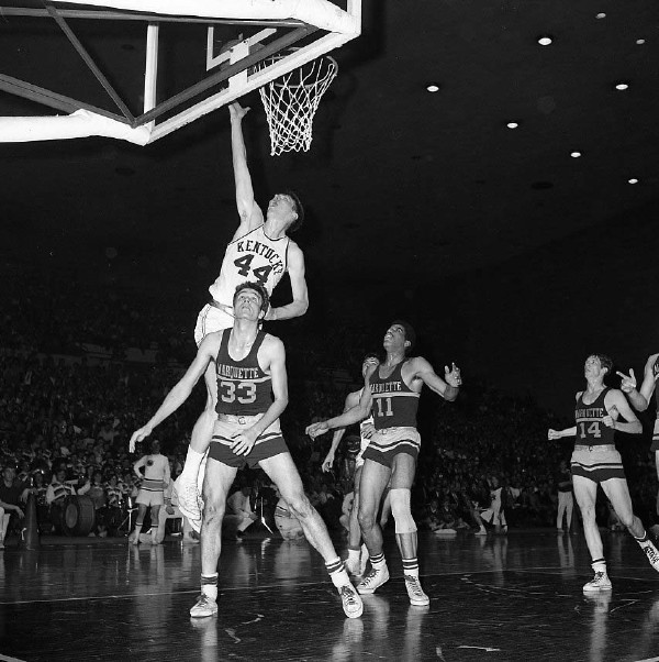 Dan Issel (#44), Gary Gamble (#50) and Mike Pratt (#22) face off against Marquette players under the board