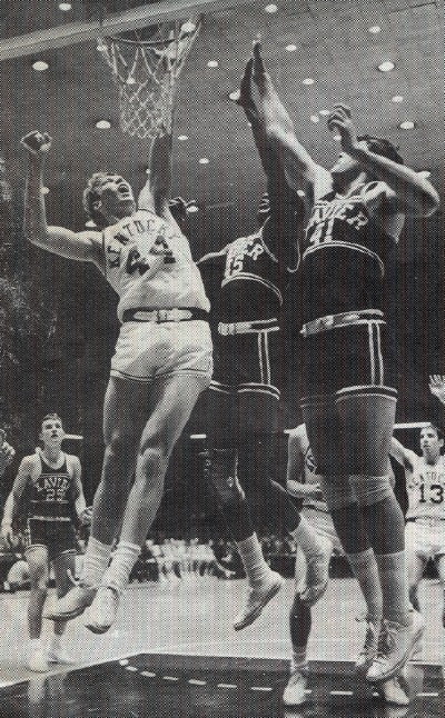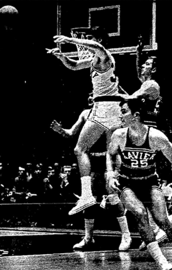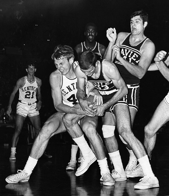 Dan Issel fights for the ball with a Xavier player while Terry Mills (#21) looks on in the background