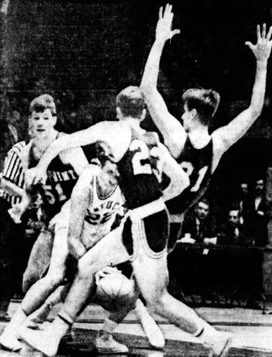 Mike Pratt (#22) is surrounded by Army's Doug Clevenger (#51), Jim Oxley (#23) and Mike Gyovia