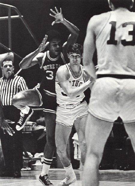 Dan Issel (#44) fights Notre Dame's Bob Whitmore (#53) and Collis Jones (#42) for a rebound.