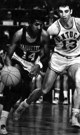 During the middle of this rally Marquette began to stall and the Wildcats went man-for man. But George Thompson quickly hit a jump shot and sensational sophomore guard Dean Meminger scored on a layup after stealing.