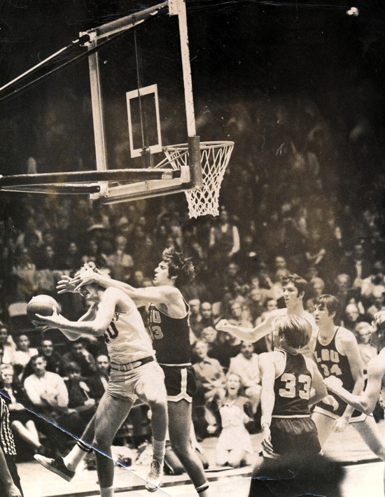 Clint Wheeler (#40) gets crushed by an LSU defender while Jim Andrews and Stan Key look on