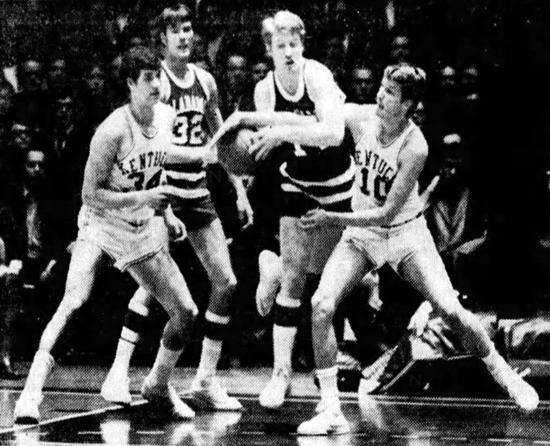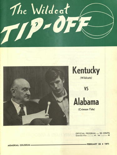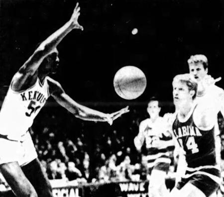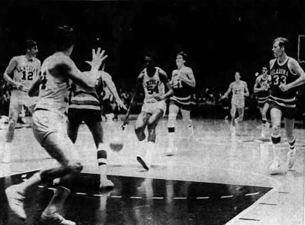 Tom Payne (#54) drives the ball while Tom Parker (#12) and Mike Casey (foreground) look to get open. Trying to get back to defend include Alabama's Alan House (#33) and Ken Hogue (#21)