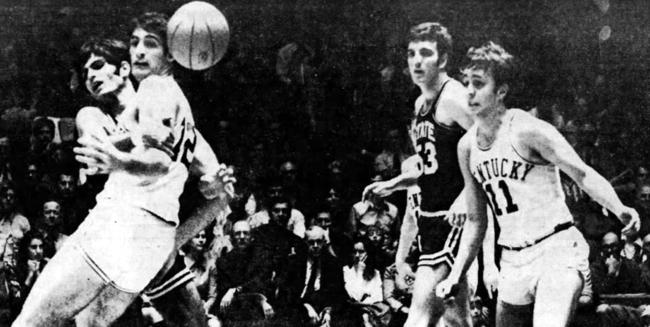 Kentucky's Tom Parker (#12) is fouled by Mississippi State's Terry Kusnierz while Mike Martin (#45) looks on