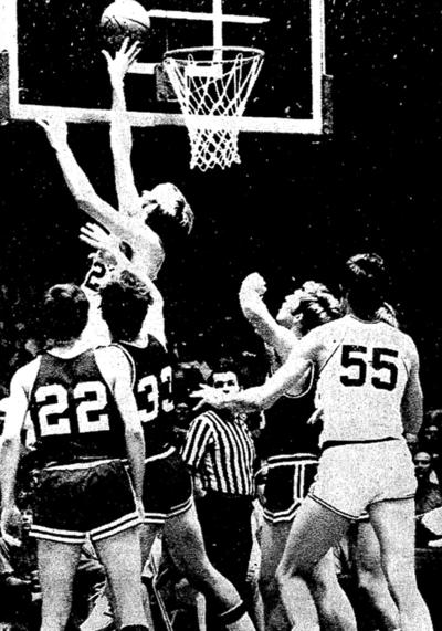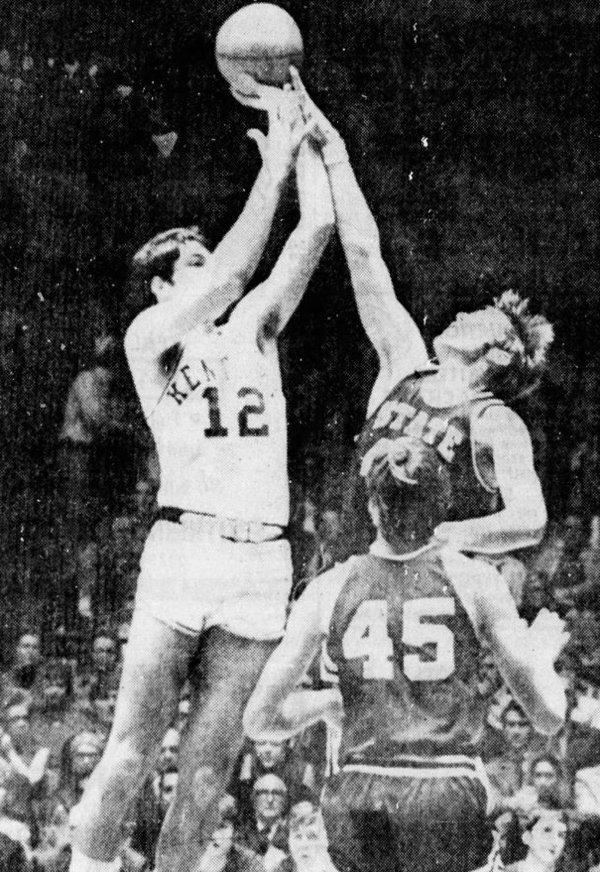 Tom Parker (#12) and Bob McCowan (#11) watch a loose ball sail away. Behind them are Mississippi State's Taki Koroneos and Bill Combs