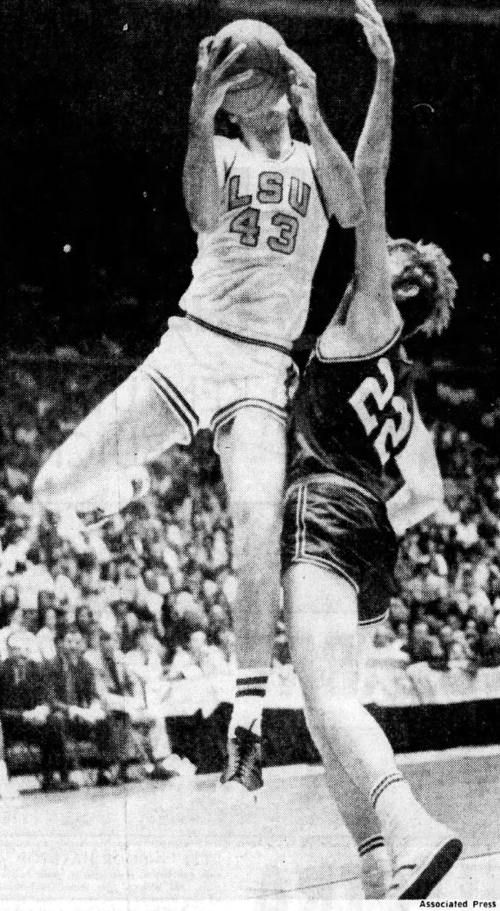 LSU's Bill Newton attempts a shot around UK's Larry Stamper (#22)
