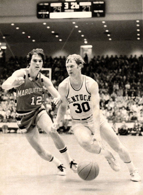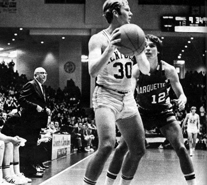 Stan Key (#30) works against Marquette's Allie McGuire (#12) while Coach Rupp looks on from the sidelines